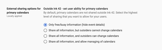 Para reducir la incidencia de filtración de datos, asegúrate de que los detalles del Calendario de Google no se compartan fuera de tu dominio. Limitar la información que se comparte a “libre” u “ocupado” protege a la organización de los ataques de ingeniería social que dependen de la recopilación de información mostrada en los títulos de las reuniones y los asistentes. (Consola de administración> Aplicaciones> G Suite> Calendario> Configuración de uso compartido)