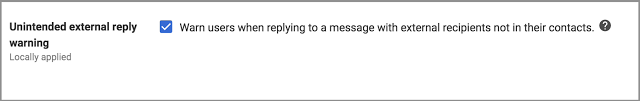 Gmail puede mostrar advertencias de respuesta externa involuntarias a los usuarios para ayudar a prevenir la pérdida de datos. Puedes habilitar esta opción para asegurarte de que si los usuarios intentan responder a alguien ajeno al dominio, recibirán una advertencia rápida para confirmar que tienen la intención de enviar dicho correo electrónico. Puesto que Gmail tiene inteligencia contextual, reconoce si el destinatario es un contacto existente o alguien con quien sus usuarios interactúan regularmente, por lo que sólo muestran advertencias relevantes. Esta opción está activada de forma predeterminada. (Consola del administrador> Aplicaciones> G Suite> Gmail> Configuración avanzada)