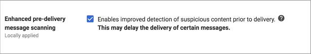Habilitando esta opción, se añaden verificaciones adicionales a los correos electrónicos potencialmente sospechosos antes de la entrega. La detección temprana de phishing utiliza un modelo dedicado de aprendizaje automático que retrasa selectivamente la entrega de los mensajes para realizar un riguroso análisis de phishing. En promedio, menos del 0.05 por ciento de los mensajes se retrasa unos minutos, por lo que sus usuarios obtendrán igualmente su información rápidamente. (Consola del administrador> Aplicaciones> G Suite> Gmail> Configuración avanzada)