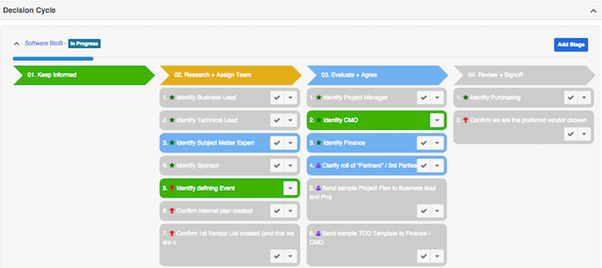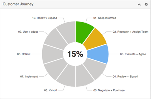 Pero, ¿cómo se muestra esto dentro del CRM? Pues bien, este plugin genera dos visualizaciones de gran utilidad tanto para los empleados como para sus responsables. Por un lado, genera un gráfico indicador del estado de decisión en el que se encuentra el cliente. En el mismo, podemos ver coloreadas las fases ya completadas y en color gris claro aquellas pendientes de realizar.