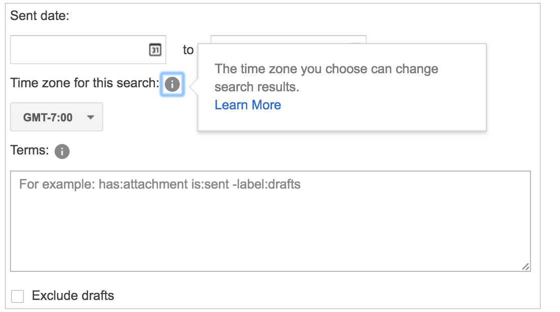 Ahora puedes seleccionar la zona horaria en la que deseas que estén basadas las fechas de tus búsquedas en Vault. La zona horaria que selecciones cambia los límites exactos de los resultados de búsqueda, por lo que te recomendamos leer más sobre el efecto de esta configuración antes de utilizarla.