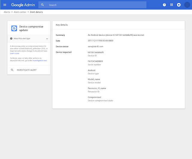 Alertas de administración de dispositivos: Google analiza diversos atributos para determinar si el dispositivo de un usuario cuenta con jailbreak o permisos de administrador. Estas alertas se muestran junto con otras alertas de administración de dispositivos relacionadas con actividades sospechosas.
