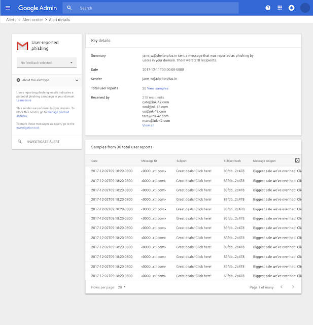 La vista unificada del Centro de alertas permitirá que todos los administradores de G Suite administren las alertas con mayor eficiencia y proporcionará recomendaciones para ayudarles a evaluar la exposición de su organización ante problemas de seguridad a nivel del dominio y del usuario.