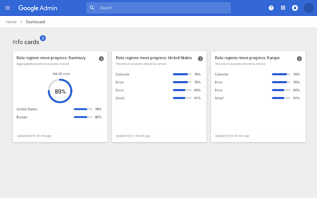 Google facilita la administración de tus regiones de datos de forma constante. Por ejemplo, cuando el propietario de un archivo cambia o se transfiere a otra UO, automáticamente Google también transfiere los datos correspondientes sin que los colaboradores vean afectada la disponibilidad del archivo (p. ej., sin tiempo de inactividad, sin restricciones de acceso de solo lectura, etc.). De manera similar, si un usuario nuevo se une a la organización, sus datos se ubicarán automáticamente en función de las políticas de su UO específica. Por último, como beneficio adicional, Google brinda a los administradores estadísticas actualizadas sobre el estado de sus transferencias de datos, de modo que puedan estar al tanto de los cambios que realicen.