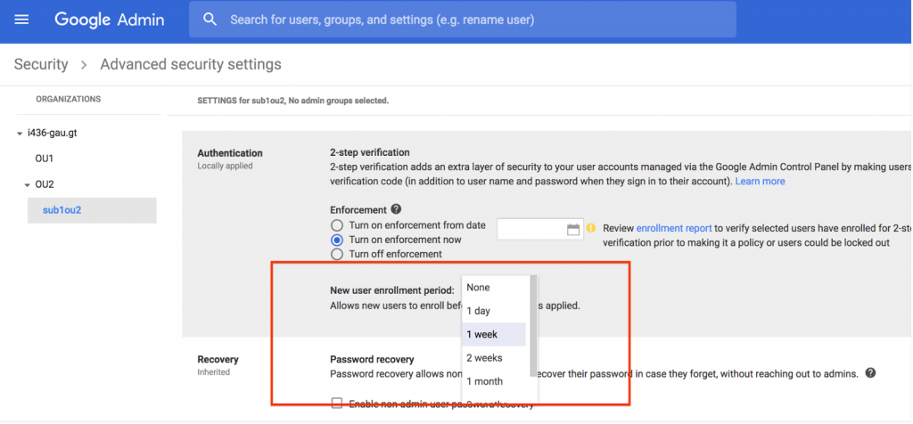 - Períodos de inscripción de verificación en dos pasos: Actualmente, cada vez que se crea un nuevo usuario en una unidad organizativa donde se aplica la verificación en dos pasos (2SV), ese usuario tiene que usar la verificación en dos pasos desde su primer inicio de sesión. Teniendo en cuenta los comentarios de algunos administradores, Google permite ahora crear períodos de inscripción para que ayuden a los usuarios a enrolarse en la verificación en dos pasos de forma más eficiente.