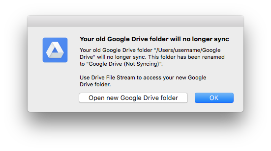 - Después del 12 de mayo, Drive File Stream mostrará un cuadro de diálogo y cambiará el nombre de la carpeta anterior de Google Drive para aclarar que la carpeta anterior no se está sincronizando.