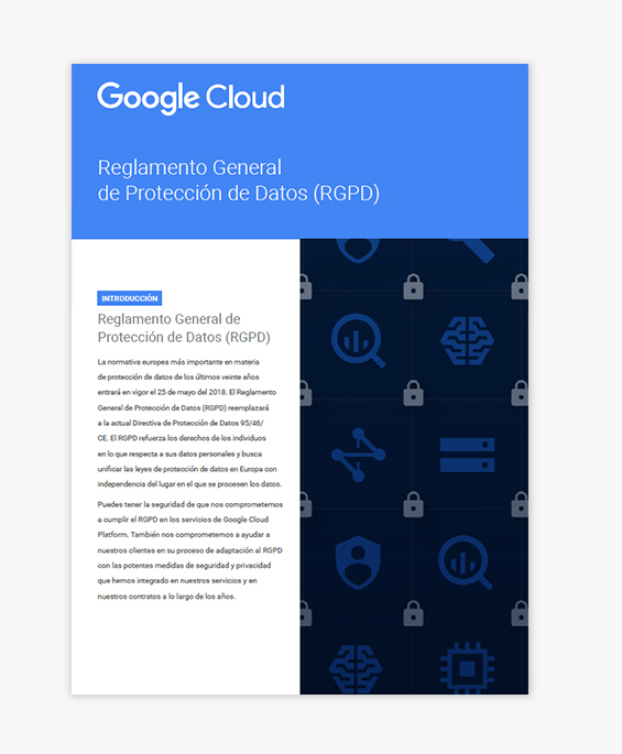 Los usuarios de G Suite pueden tener la seguridad de que en Google están comprometidos a cumplir con las exigencias del RGPD en los servicios de G Suite y de Google Cloud Platform (GCP) cuando este entre en vigor el 25 de mayo del 2018. Además de realizar actualizaciones importantes en los compromisos contractuales que están directamente relacionados con los requisitos del RGPD, se implicarán en el proceso de cumplimiento de sus clientes en lo referente a dicha normativa. Los usuarios pueden utilizar los servicios de Google Cloud con la tranquilidad de saber que cuentan con unas funciones de protección de datos integradas totalmente sólidas.