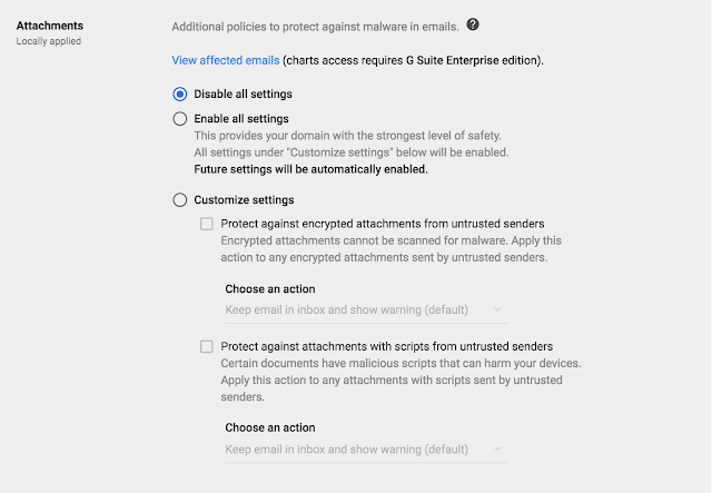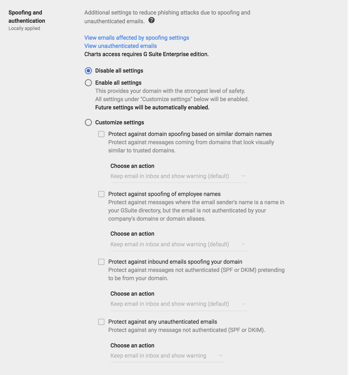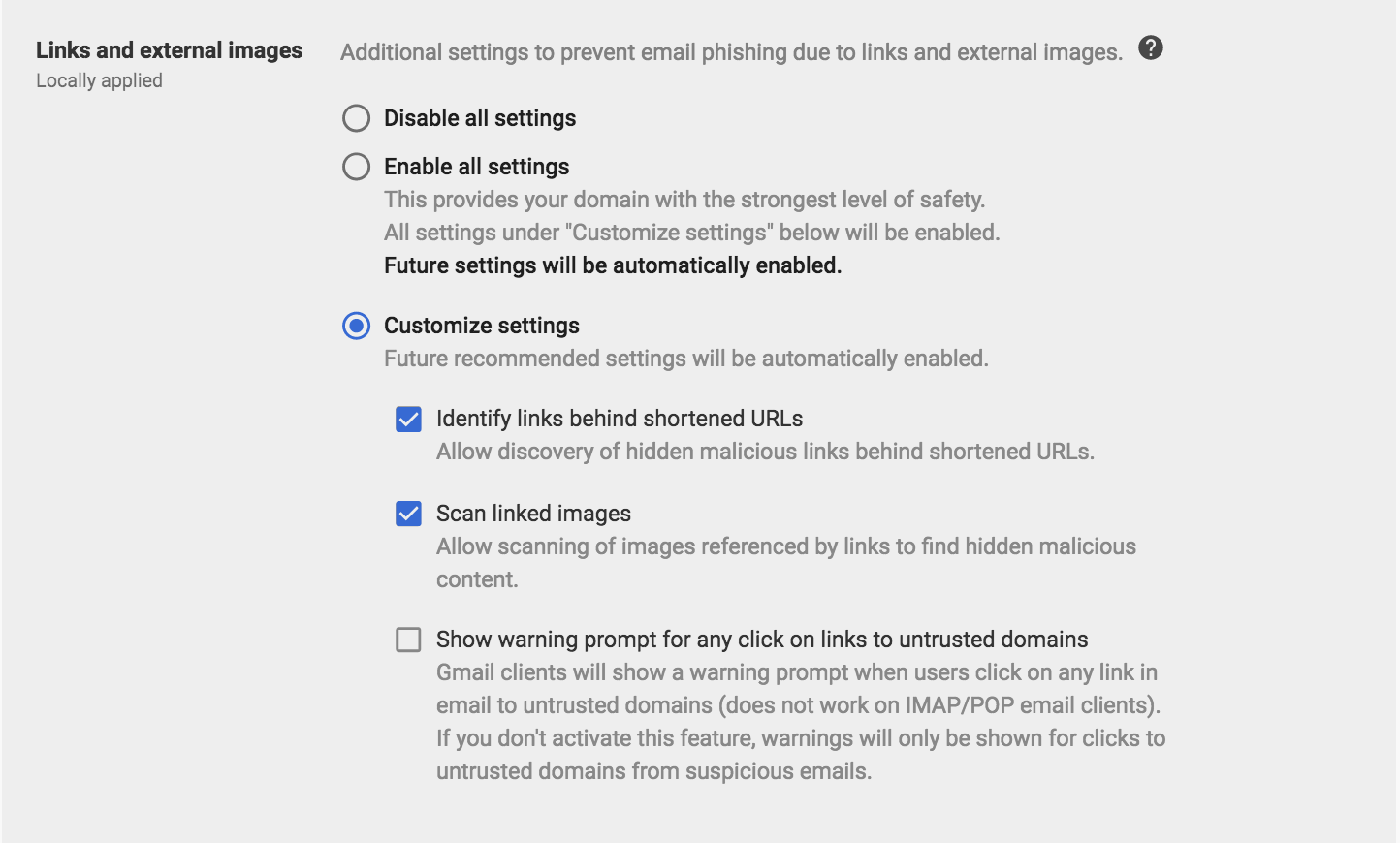 Después de este lanzamiento, encontrarás la nueva configuración en la Consola del administrador en Aplicaciones> G Suite> Gmail> Seguridad. Cada una de las secciones puede ser habilitada, deshabilitada o personalizada.