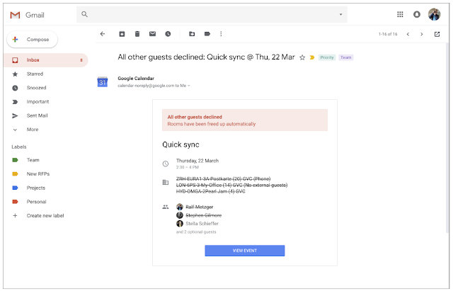 De acuerdo con un estudio interno de Google, hasta el 40% de las salas que se reservan luego no se usan. Para ayudar a tus usuarios a reclamar las salas que no se usan, ahora Google libera de manera automática las salas de reuniones si todos los invitados menos uno rechazan la invitación de Calendario de Google. Cuando la sala se libera, el organizador del evento recibe un correo electrónico que le informa el cambio y le sugiere la reprogramación o eliminación de la reunión.