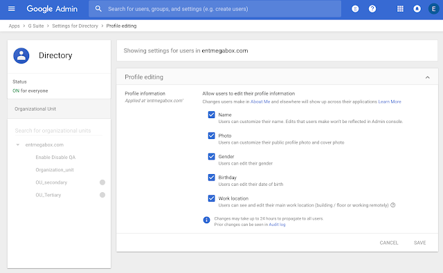 Si no conoces la ubicación de los usuarios, puedes permitir que los empleados la establezcan por su cuenta. Simplemente accede a la Consola de Administración y haz clic en Aplicaciones > G Suite > Directorio > Edición de perfiles y luego selecciona “Ubicación de trabajo”.