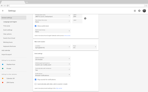 - Los usuarios pueden actualizar su ubicación principal de trabajo por su cuenta. Los usuarios pueden establecer y actualizar su ubicación en la configuración de Calendario.