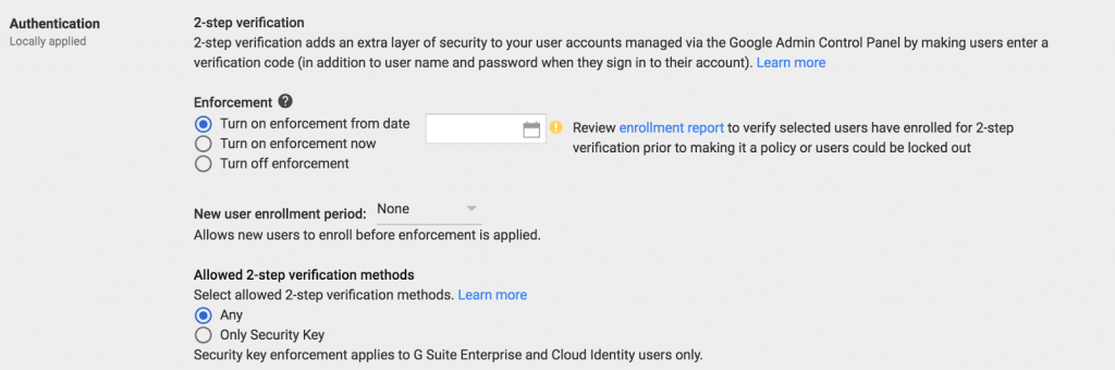 A verificação em dois passos (2SV) é uma das melhores formas de impedir que alguém acesse a sua conta, mesmo que roubem sua senha. No G Suite, os administradores têm a capacidade de reforçar a verificação em dois passos. A verificação em dois passos, pode reduzir o risco de ataques sucessivos de phishing, solicitando aos funcionários provas adicionais de identidade quando fazem login. Estas provas podem ser solicitadas em forma de mensagens telefônicas, chamadas de voz, notificações de aplicações móveis e muito mais.