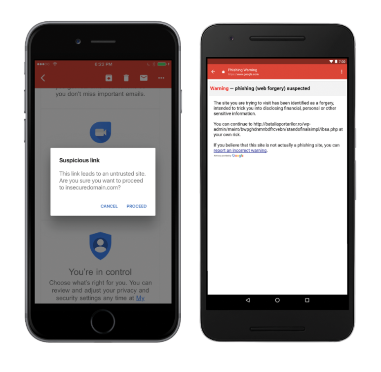 Os clientes do Gmail (Android, iOS, Web) aproveitam a navegação segura do Google para incorporar medidas de segurança contra o phishing, como desabilitar links suspeitos e mostrar advertências aos usuários para desencorajá-los a clicar nestes links.