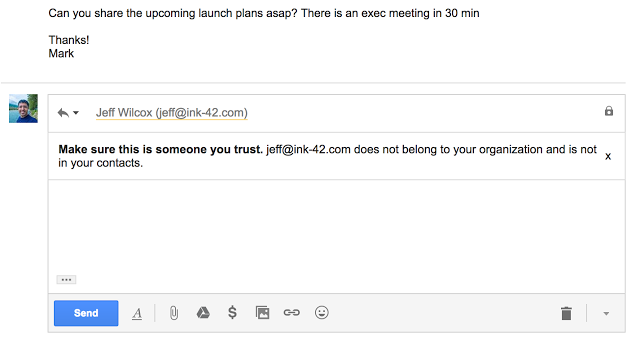 Por padrão, os clientes do Gmail (Android, Web) advertem os usuários do G Suite se eles respondem emails recebidos de fora do seu domínio por alguém com quem não interagem regularmente ou que não está incluído em seus contatos. Isso ajuda as empresas a se proteger contra emails falsos, de agentes mal intencionados ou simplesmente erros acidentais de usuário, como enviar um email para um contato errado. Educar os funcionários para buscar estas advertências e ter cuidado antes de responder a remetentes não reconhecidos. As advertências de resposta externa não intencionais são controladas no Console de administração a partir da “Configuração avançada” do Gmail.