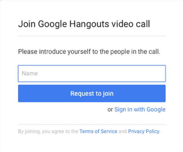 A partir de agora, este recurso é ainda mais útil por tirar a exigência de que os convidados têm que ter uma conta Google Hangouts para se juntar a uma vídeo chamada de Hangouts. Veja como funciona: Os clientes sem conta Google aos quais o organizador lhes deu um link para a video chamada, só têm que dar o seu nome e, em seguida, pedir para se juntar à chamada.
