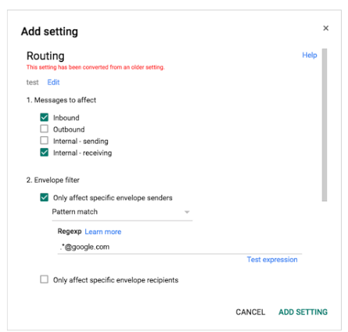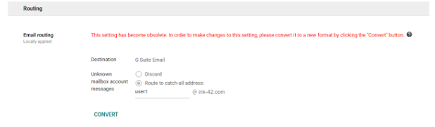 A partir da semana de 23 de Janeiro de 2017, as opções de roteamento de envio, roteamento de recepção, direção geral e roteamento de domínio existentes, serão convertidos para somente leitura. Estas definições ainda estão ativas, mas para poder realizar alterações, você deve utilizar o botão CONVERTER, junto a regra existente. Google tomou medidas para tornar este processo o mais simples possível, convertendo o ajuste existente anteriormente e atribuindo-o automaticamente aos novos campos. A configuração convertida é colocada na seção de roteamento unificado, onde todas as regras podem ser gerenciadas a partir de um único lugar. A configuração antiga não será mais visível no interface de usuário antigo, por isso não é necessário limpar as regras anteriores.