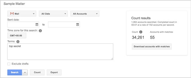 A partir de agora, além do número total de resultados, você também verá o número de contas com coincidências. Depois, você pode baixar uma lista dessas contas e a quantidade de mensagens que coincidam com cada uma. Isso pode te ajudar a determinar os responsáveis pela custódia envolvidos em uma investigação. (Observe que esta função só está disponível ao pesquisar mensagens do Gmail).