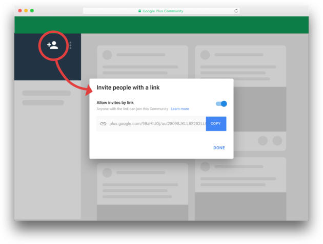 Se houver alterações, você pode desabilitar facilmente um link compartilhado ou gerar um novo em qualquer momento. Para compartilhar um link de convite para a sua comunidade, abra o menu de convite na web do Google+, ative a opção “Permitir convidar por link” e copia o link que aparece.