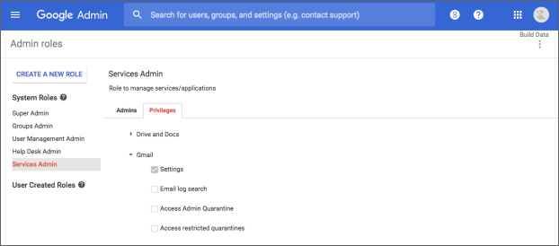 Os super administradores podem delegar estes privilégios aos usuários clicando em CRIAR UMA FUNÇÃO na seção de Funções de administrador do Console de administração e, em seguida, selecionando Administrador de Serviços> Gmail e a permissão específica do menu Privilégios.