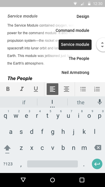 Esta versão também permite se mover através de documentos via telefone ou tablet Android. Quando nos deslocamos em dispositivos móveis, um pequeno controle de navegação aparecerá automaticamente. Ao selecionar o controle, toda a estrutura do documento será exibida, permitindo saltar rapidamente de uma seção para outra, ao invés de ter que deslizar lentamente para cima e para baixo.