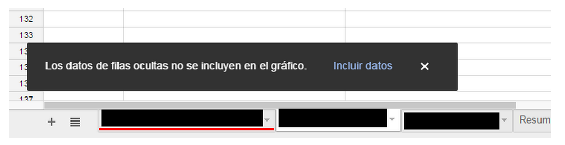 Verificando em detalhe, se você criar um gráfico na web, em planilhas, e depois filtrar ou ocultar algum dado utilizado, aparecerá uma mensagem indicando que os dados foram apagados do gráfico e uma opção para reincluir. Esta opção só está disponível no aplicativo Web, mas as alterações configuradas também se aplica aos aplicativos móveis.