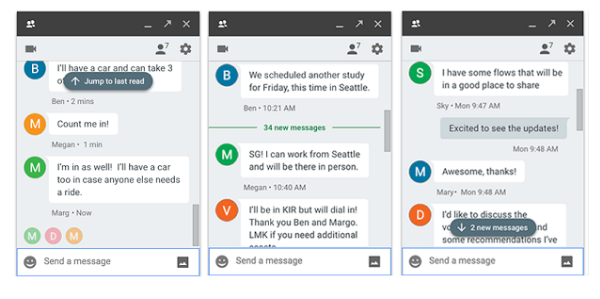 Houve algumas melhorias na forma de navegar por chats, tanto no Google Hangouts de escritório como no Android. Quando acessar uma conversa que tenha muita atividade, você visualizará um botão “Ir para última leitura”. Isto nos levará para última mensagem não lida na conversa marcado pelo indicador “#mensagens novas”. Além disso, o botão “#mensagens novas” foi redesenhado para coincidir com a nova interface do usuário. Confira a imagem abaixo para ver como funciona: