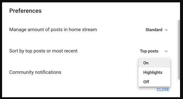 Quando a opção Destacados estiver selecionada, o Google enviará uma notificação resumida das publicações mais importantes de todas as suas comunidades e coleções do G+. Isso ajudará você a economizar tempo e assegurar-se de que está vendo as publicações que mais lhe interessam.