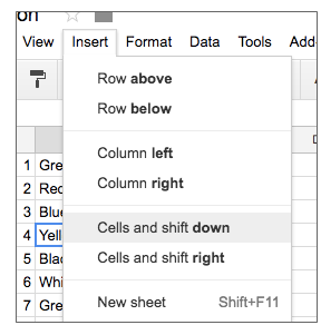 Você pode inserir células à partir do menu Inserir e eliminar células do menu Editar. Ambas as funções, também são acessíveis quando você seleciona com o botão direito do mouse em uma célula.