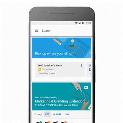 Por exemplo, ao abrir a aplicação do Cloud Search em seu telefone ou em seu laptop, você verá informação relevante organizada em cartões simples (cartões de assistência) que te ajudarão a manter-se informado instantaneamente em teu trabalho. Os cartões de assistência são uma nova forma de te ajudar a encontrar a informação correta no momento adequado. Utilizando a tecnologia de inteligência artificial do Google, estes cartões podem te ajudar a se preparar para uma próxima reunião ou até mesmo sugerir arquivos que podem necessitar de sua atenção. Os cartões de ajuda estão projetados para ser oportunos e relevantes para que você possa gerenciar seu dia de trabalho de maneira mais eficiente. A medida que o Google continua aprendendo como a informação é mais útil para você, mais cartões de assistência de Cloud Search são adicionados.