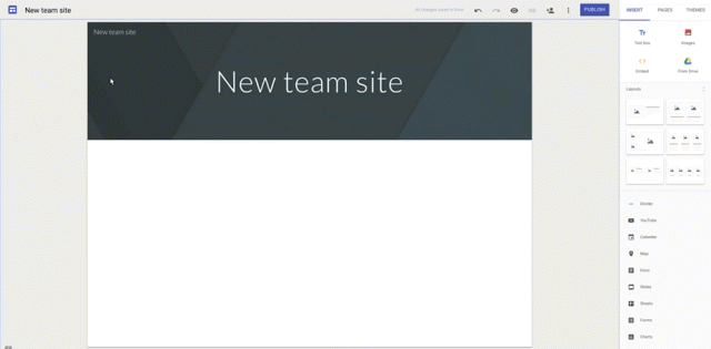 Neste lançamento, foram incluídas seis opções de seção pré-desenhadas. Você poderá vê-las no menu Inserir, que está no painel direito de Sites. Para usá-las, basta clicar em um desenho e arrastá-lo para a página. Uma nova seção será adicionada ao seu site; esta seção será automaticamente propagada com o conteúdo de marcador de posição que corresponda ao design. Logo, você pode agregar seu próprio conteúdo para personalizar o design segundo suas necessidades.