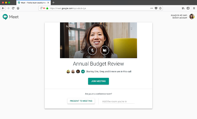 Além disso, para garantir que seu domínio tenha uma transição tranquila para o Meet, o Google adicionou o suporte ao Meet with Firefox (a partir da versão 60). Ao contrário dos Hangouts clássico, o Meet usa protocolos WebRTC nativos, por isso não requer downloads ou complementos ao usar o Meet no Firefox.