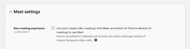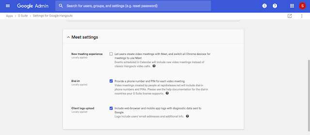 Em março de 2017, o Google introduziu o Hangouts Meet, a próxima geração de vídeo-conferências empresariais. Após o feedback positivo contínuo dos clientes que começaram a usar o Meet em 29 de maio, o Google ativará o Hangouts Meet para todos os domínios do G Suite que são atualizados automaticamente no programa recomendado do Google.