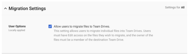 Se você habilitar esta configuração no Console do administrador (Apps> G Suite > Drive > Configuração da migração > Opções de usuário> Permitir aos usuários migrar arquivos para Drive de equipe), os usuários do seu domínio poderão mover arquivos individuais para Drive de equipe, desde que tenham acesso de edição a esses arquivos e os proprietários atuais sejam membros do Drive de equipe de destino.