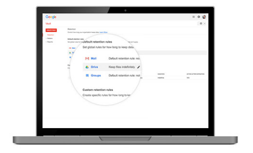 As novas funcionalidades do Google Vault para Drive oferece aos administradores os controles de gestão que necessitam para administrar e proteger todos seus arquivos, tanto em unidades de funcionários como em Drives de equipe. Estas novas características permite aos administradores estabelecer políticas de retenção que, automaticamente, mantém o que necessitam e descartam o que não é necessário. Por exemplo, é possível que se necessite estabelecer uma retenção legal em arquivos que são críticos para um determinado caso legal.