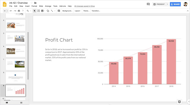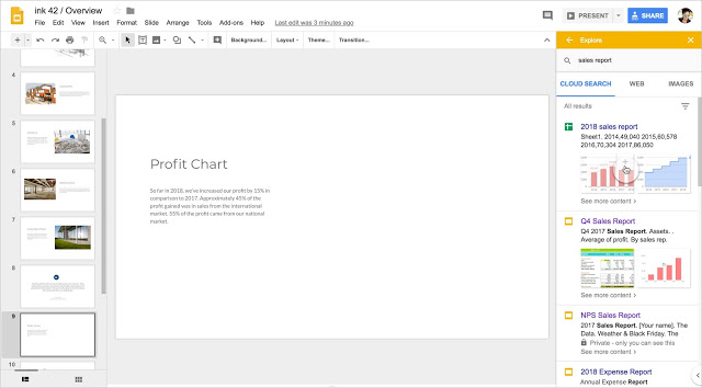 A função Explorar de Apresentações e Documentos do Google facilita a pesquisa de arquivos do Google Drive relacionados com seu trabalho atual. Com esta versão, os usuários do G Suite Basic, Business e Enterprise podem visualizar as imagens e os gráficos desses arquivos, diretamente no painel Explorar e, em seguida, inseri-los de forma rápida e simples em seu documento ou apresentação.