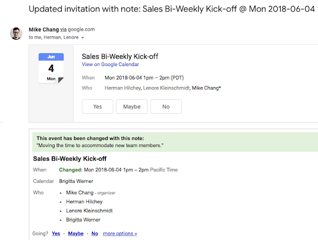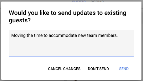 Existem muitos motivos pelos quais você queira fazer alterações em uma reunião; a Google trabalha para que, comunicar estas alterações, seja mais simples. À partir de agora, quando você modificar ou excluir uma reunião existente, será exibido uma caixa de diálogo onde você pode escrever uma mensagem para os demais convidados.