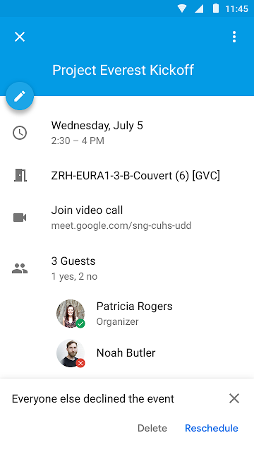 Sem precisar entrar nos detalhes de um evento, ou examinar sua caixa de entrada para respostas de RSVP, agora você pode visualizar antes, quando os demais participantes rejeitarem uma reunião. Uma indicação sobre o evento será exibida, indicando que todos os convidados o rejeitaram.
