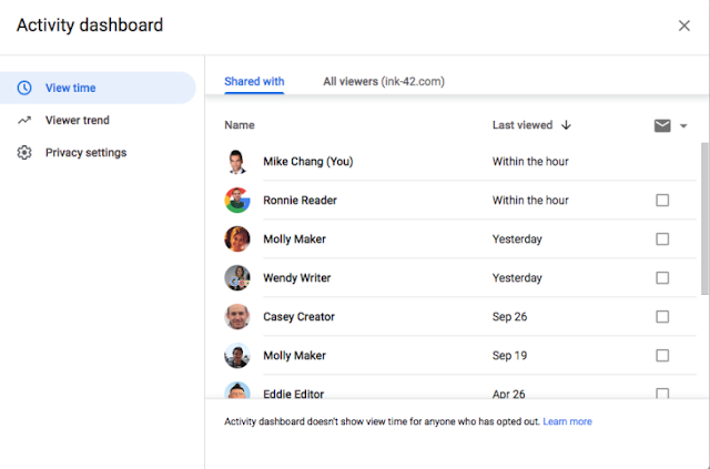 Clicando no ícone, abre o painel de controle, onde você poderá analisar as estatísticas de tempo e ajustar a privacidade e a configuração do documento. Este botão lhe dará acesso instantâneo às informações do painel de atividades que você está procurando. Ao percorrer o ícone, você pode ver a informação que outros podem ver sobre você no Painel de atividades. Para obter mais detalhes sobre como ver o histórico de visualização de seus arquivos do Google Docs, Planilhas e Apresentações, consulte o link a seguir.