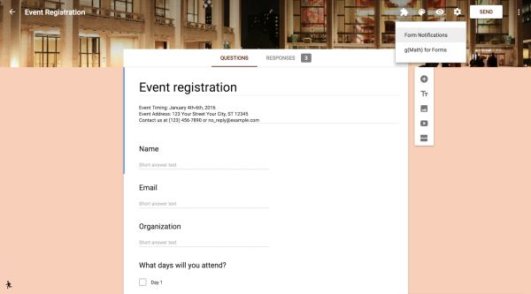 Os criadores de Formulários terão a possibilidade de usar add-ons e editar scripts no novo editor de formulários. Aplicações populares como Form Publisher e g(Math) ajudam os criadores a ampliar a capacidade dos formulários do Google.