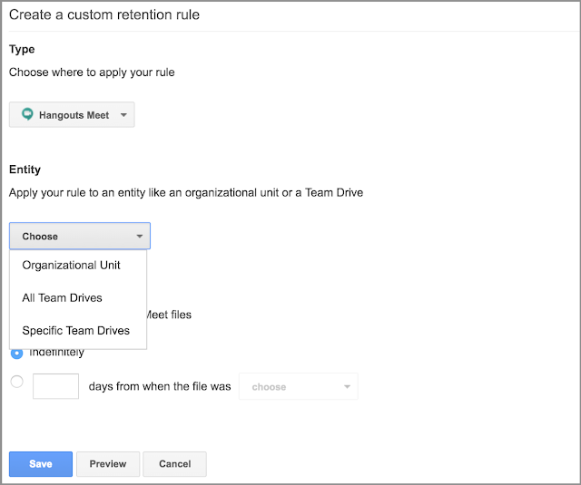 Antes, as gravações do Hangouts Meet estavam sujeitas às regras de retenção do Drive aplicáveis. Com este lançamento, você pode estabelecer regras de retenção padrão e personalizadas especificamente para Hangouts Meet. Isso permitirá que você estabeleça períodos de retenção mais curtas para as gravações Meet se, por exemplo, tiverem conteúdo confidencial.