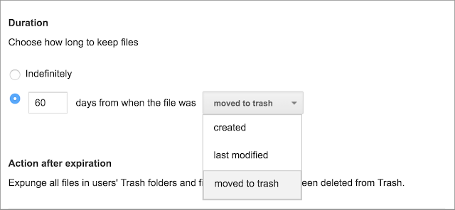 Como administrador de G Suite, agora você também pode estabelecer regras de retenção personalizadas especificamente para arquivos do Drive que foram movidos para a lixeira de um usuário. Esta opção proporciona mais flexibilidade para as organizações que desejam controlar o ciclo de vida dos arquivos excluídos pelos usuários de forma separada daqueles arquivos que ainda estejam ativos na Minha Unidade e nas unidades de equipe de seus usuários.