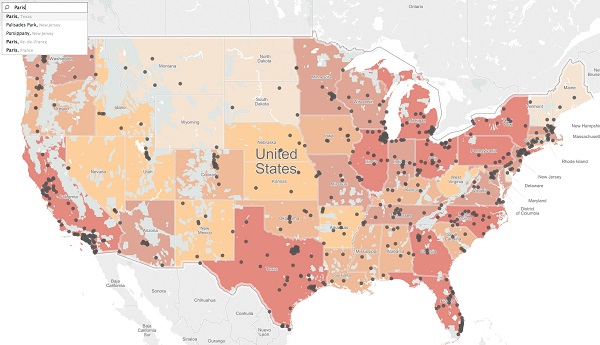 - ¿En qué lugares estoy teniendo pérdidas, es decir, se venden menos sierras? Para ello podremos usar los mapas inteligentes: Si estoy interesado en conocer la venta según ciudades, puedo crear en mi dashboard un mapa que lo plasme para hacerlo aún más visual. De hecho, en la nueva versión de Tableau, 9.0, los mapas inteligentes han sido mejorados, de modo que la interacción es aún sencilla y las respuestas a preguntas geográficas (hasta en calles donde se producen ventas) se producen con mayor facilidad. De este modo podremos tomar medidas para reforzar estas ventas.