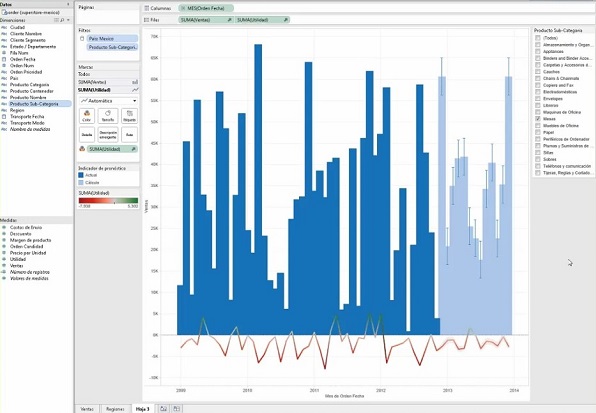 - Pronósticos: ¿Cuántas sierras se estima que venderemos los próximos meses? Para responder a esta pregunta, Tableau Software nos da la posibilidad de hacer pronósticos de ventas, como podemos ver en esta imagen: ventas hasta la fecha en azul más intenso, pronóstico de los próximos años en azul más claro.